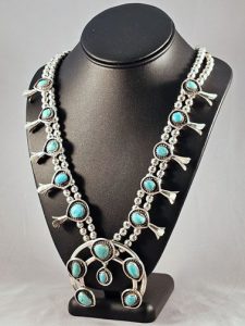 Squash Blossom Necklaces: Traditional Navajo designs featuring the iconic squash blossom pattern in necklaces.