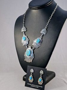 Turquoise Necklace and Earring Sets: The most popular choice, featuring the protective blue-green stone beloved across Native cultures. Turquoise symbolizes protection, strength, and good fortune.